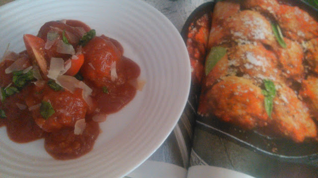 Guličky naložíme na taniere, polejeme omáčkou, každú porciu posypeme syrom, dozdobíme bazalkou a cherry paradajkami.